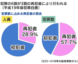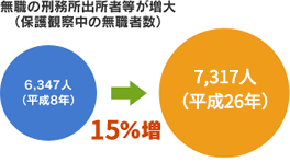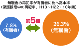 平成22年中の刑務所からの仮釈放者14,472人のうち、11,794 人(約81%)が無職者です。 再犯をする人の多くが、職のない人というデータもあります。