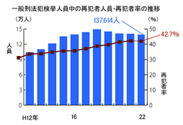 再犯者の人員は引き続き高水準、その割合は上昇しています。 刑務所からの釈放者のうち、満期釈放者の約53.4%、仮釈放者の約30%が5年以内に再犯をしています。
